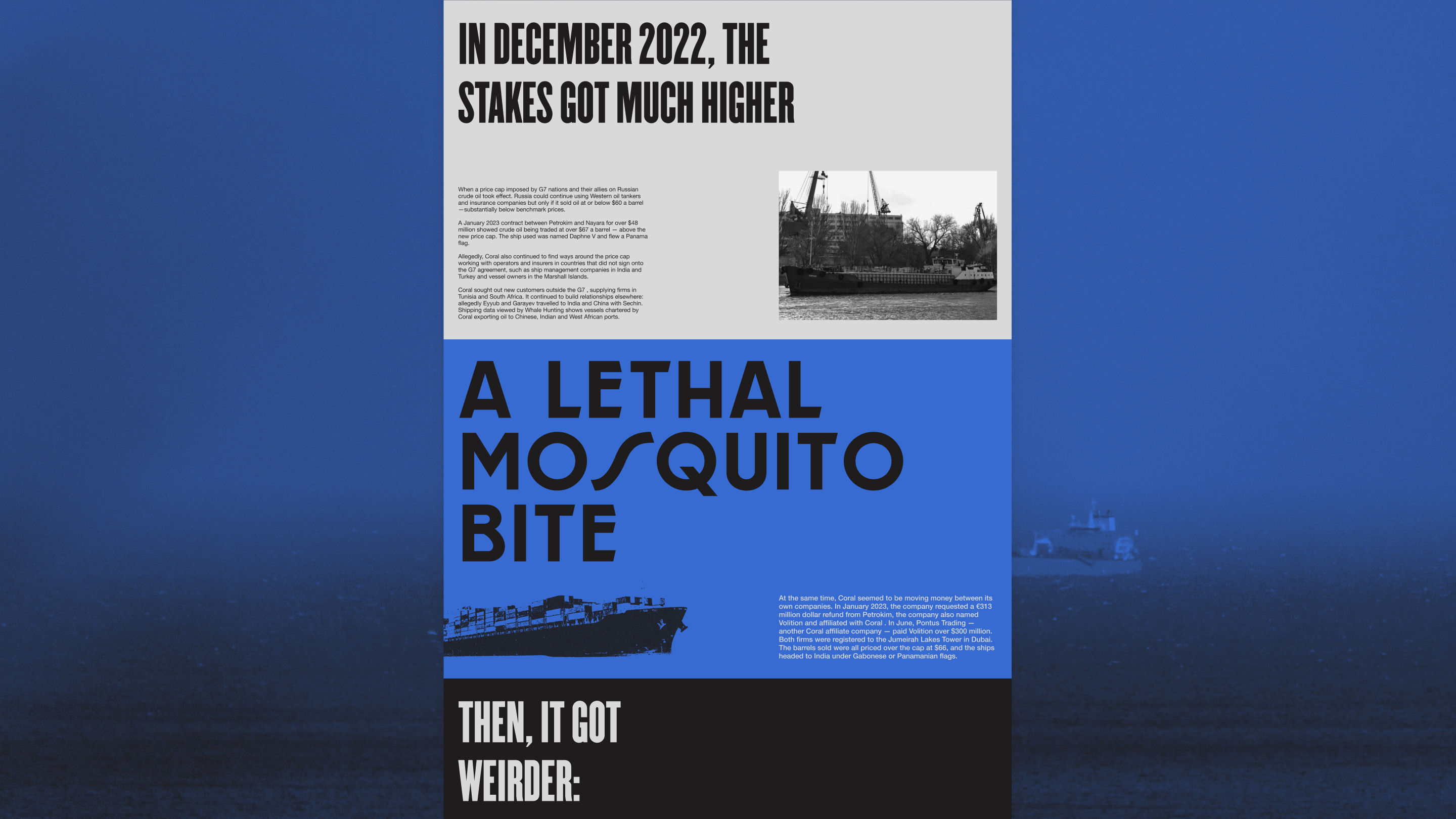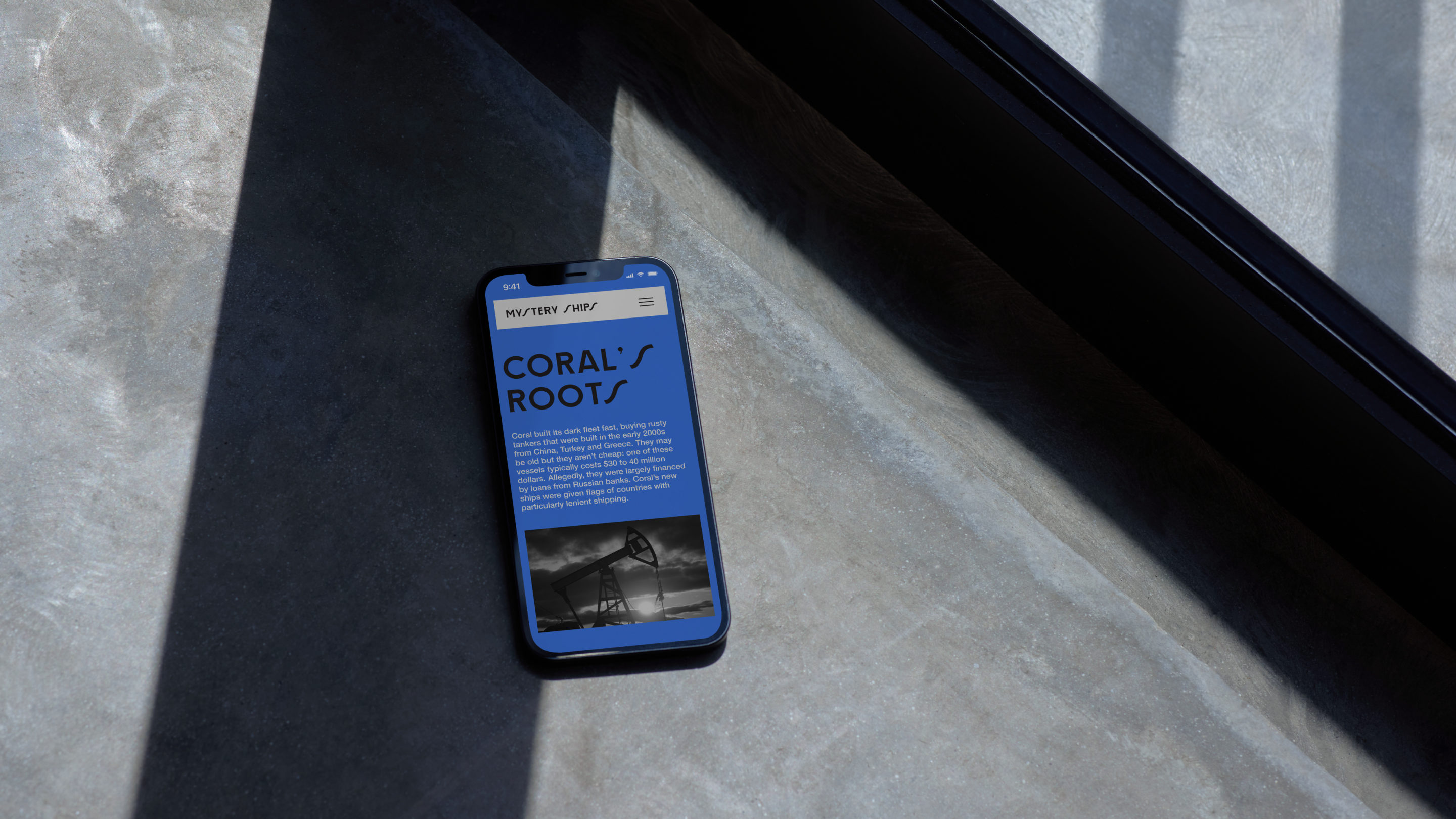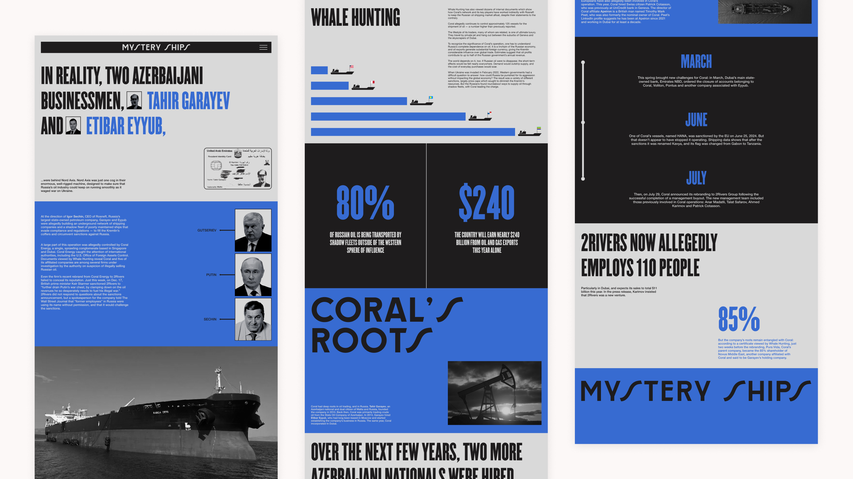 We turned investigative journalism into a digital experience with Mystery Ships, a deep dive into Russia’s covert energy operations. Whale Hunting conducted original research and reporting to break the story, then we designed a bespoke interactive microsite with custom infographics to visualize the story. The result is a compelling web report that drew global attention to hidden players in Russia’s oil trade.